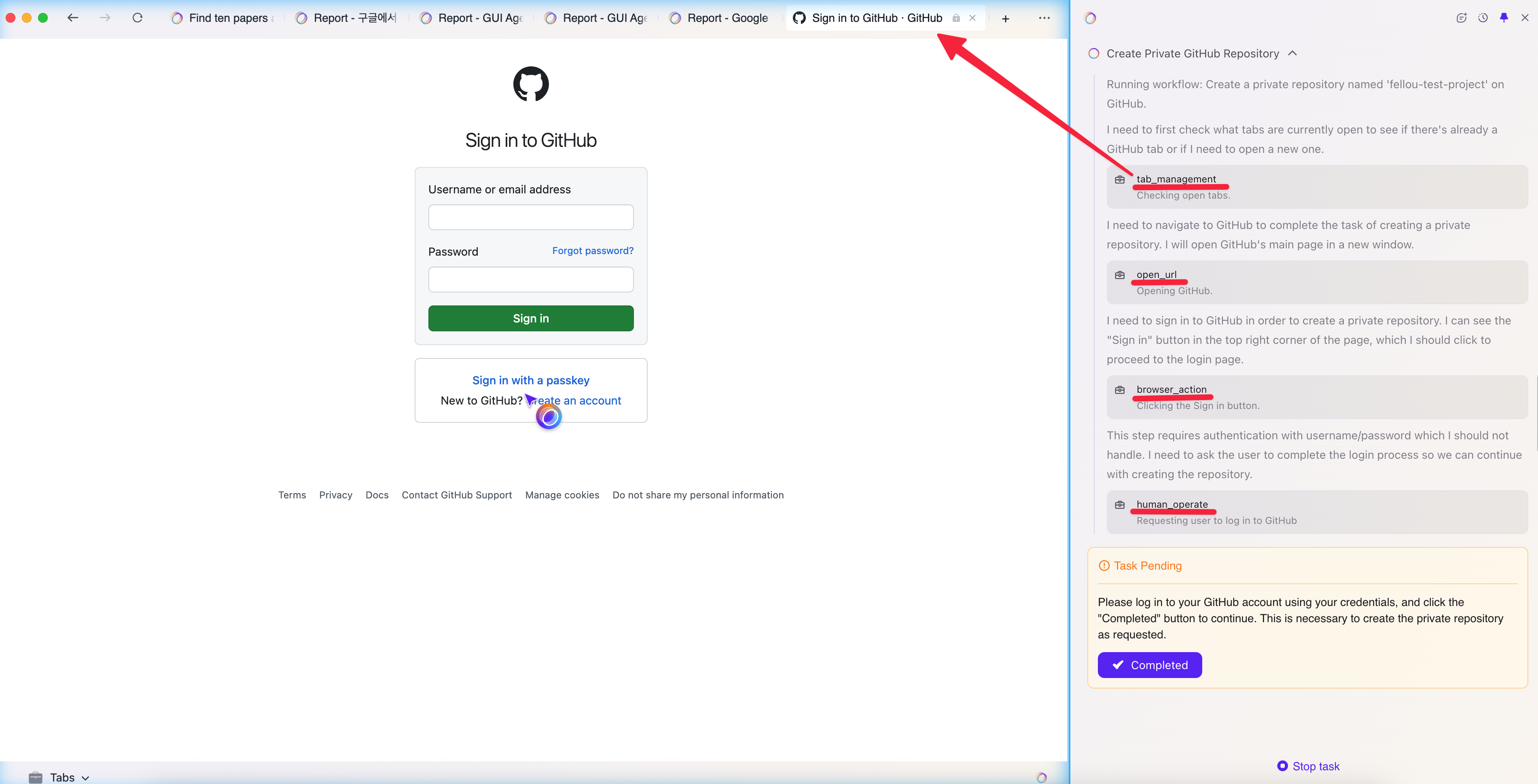 실행을 하게 되면 github을 찾아서 알아서 로그인 페이지로 이동합니다. 그리고 계정 정보를 입력하고 completed를 클릭하면 계속해서 task를 진행하게 됩니다.